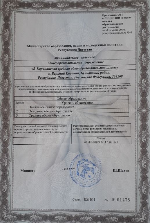 | Адрес местонахождения образовательной организации* | 368212, Буйнакский район, с.В-Каранай |